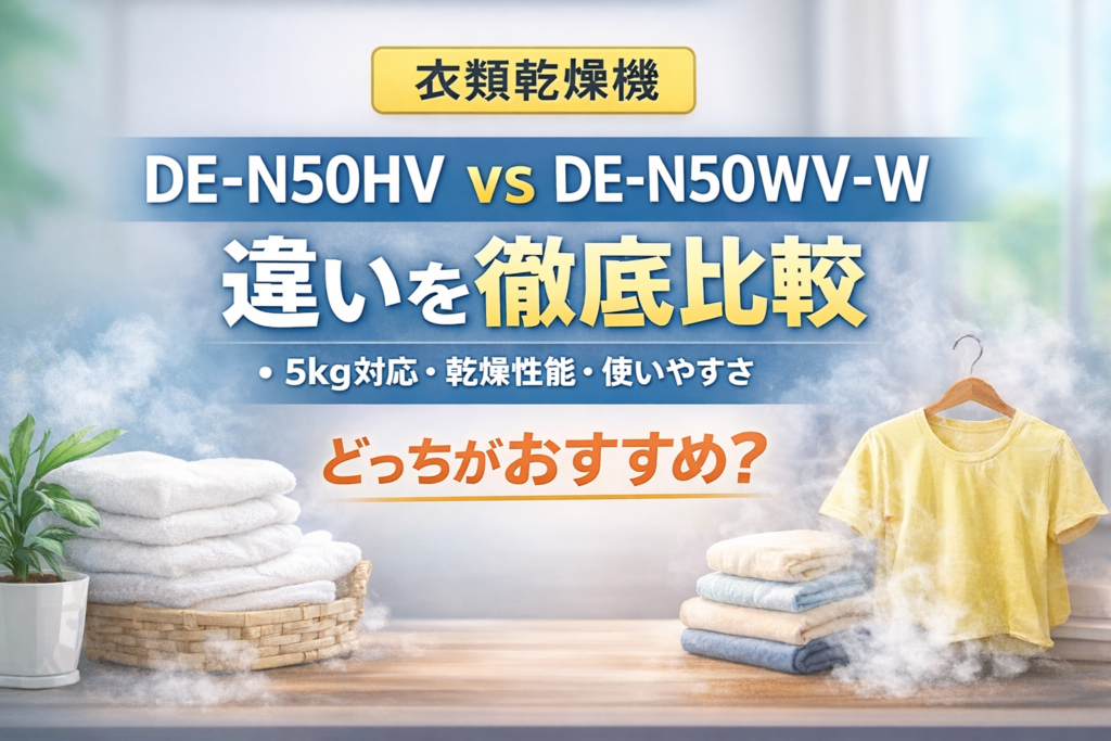 この記事が、DE-N50HVとDE-N50WV-Wの違いを知りたかった方のお役に立てれば嬉しいです。 — **①パーマリンク** `de-n50hv-de-n50wv-w-difference` **②メタディスクリプション** 結論:デリケート素材ケアならDE-N50HV、シンプル操作ならDE-N50WV-W。違いは低温乾燥・除菌コース・抗菌仕様の3つ。DE-N50HVのみ除菌75℃対応。旧型はほぼ入手不可のため新品ならDE-N50HV一択。選び方を詳しく解説。 — **③テキスト(口コミリンク)**